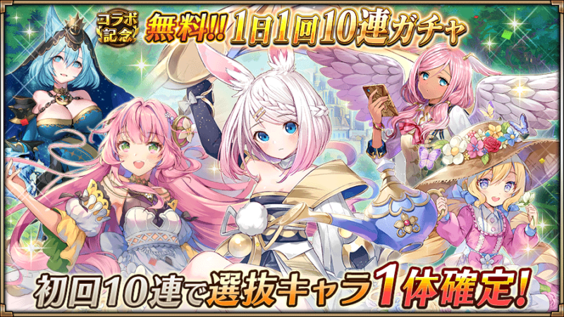 コラボを記念して毎日無料10連ガチャを開催!初回10連の際、即戦力キャラが1体必ず獲得できる!
