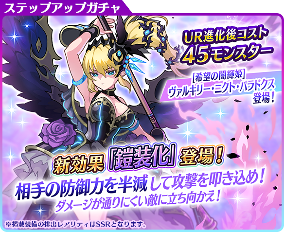 新登場の「[希望の闇輝姫]ヴァルキリー・ニクト・パラドクス」や「闇薔薇シリーズ」の武器・防具など新装備が獲得でき、最大で120連分のガチャを引くことができます。